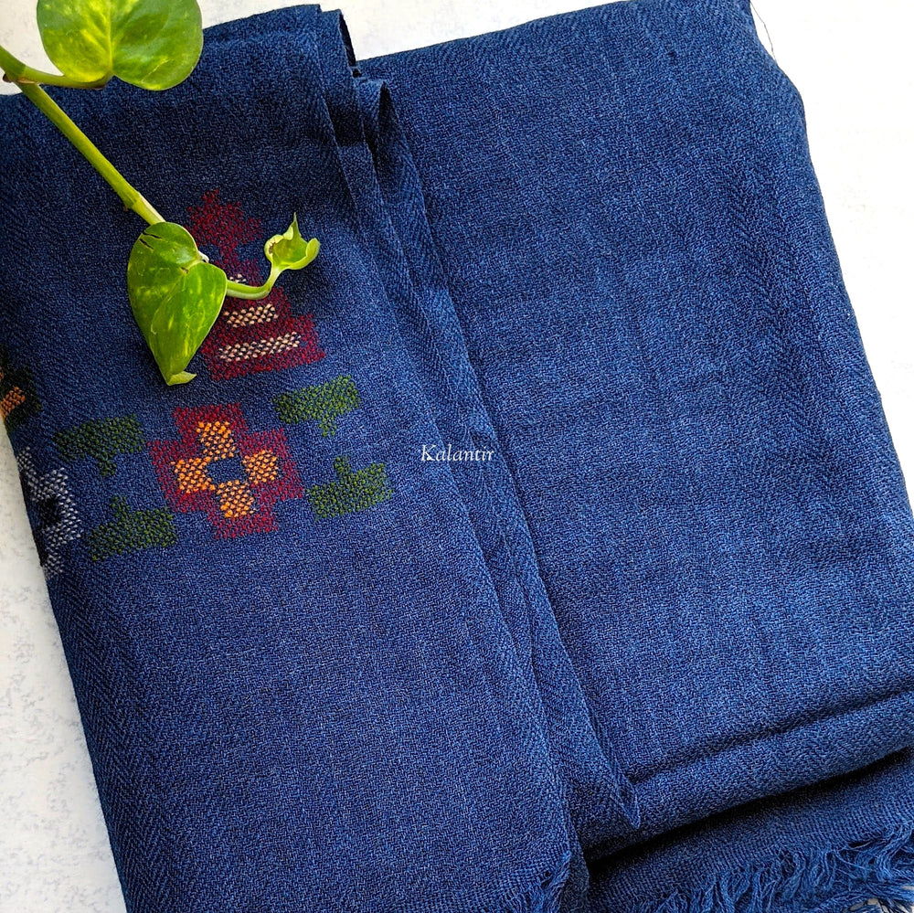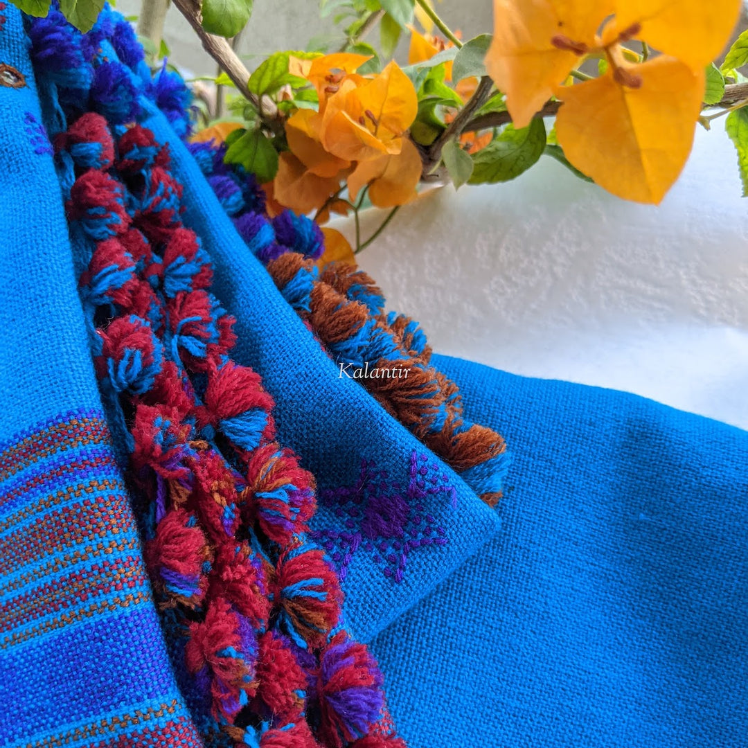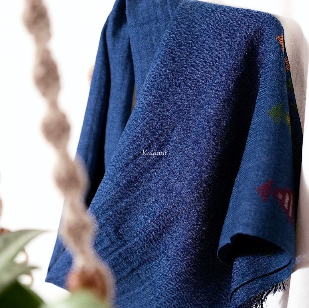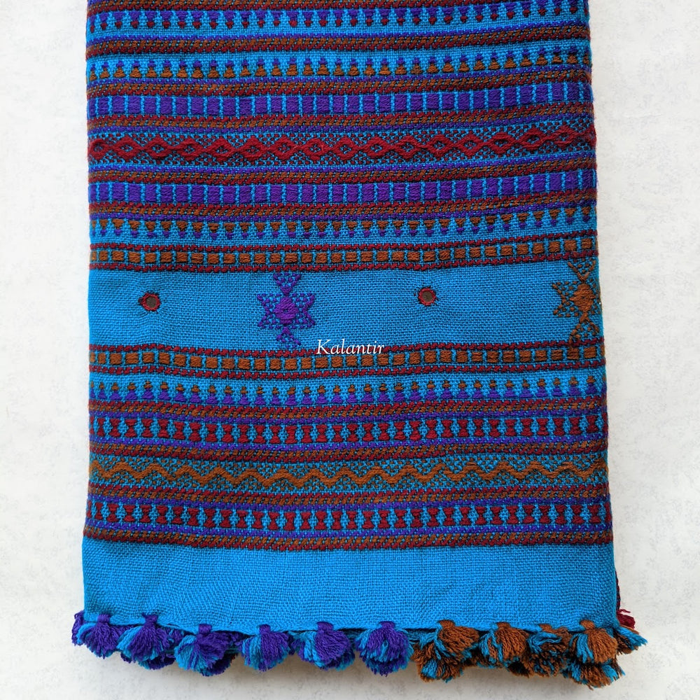 Bright Peacock Blue Colored Handmade Woollen Kutchi Shawl with Beautiful Embroidery