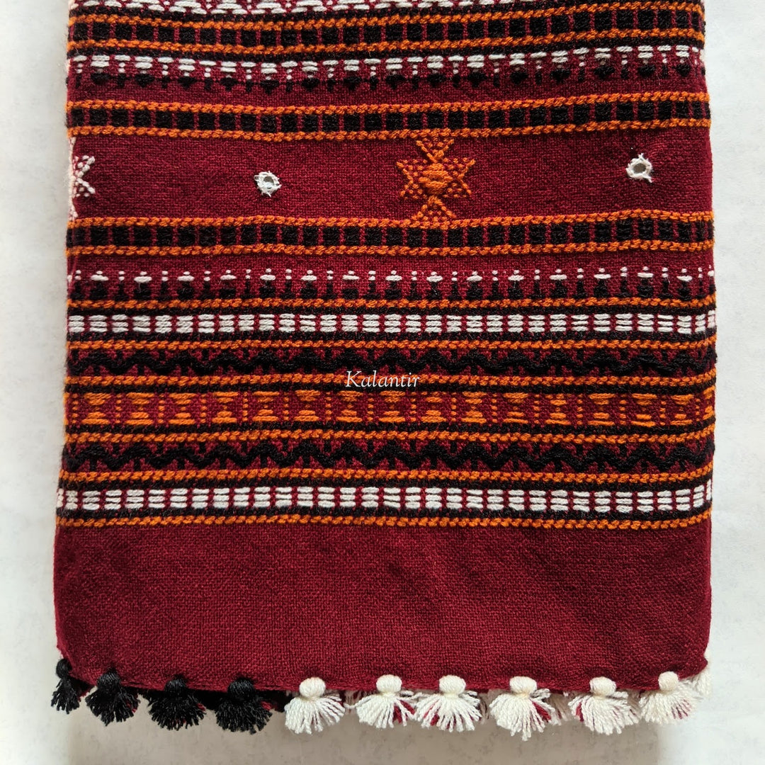 Burgundy Red Colored Handmade Woollen Kutchi Shawl with Beautiful Embroidery