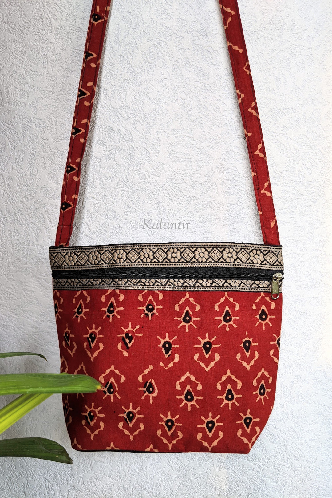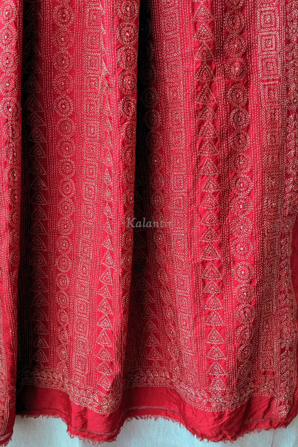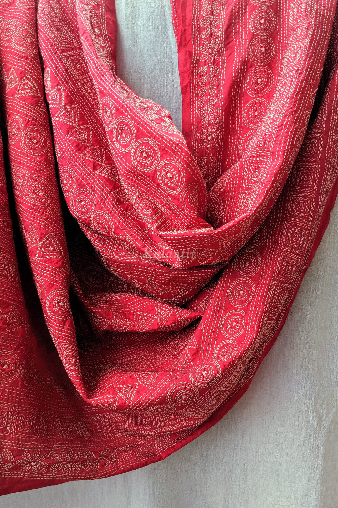 Authentic Hand-embroidered Kantha Silk Dupatta in Red