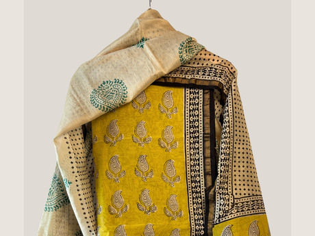 हैंड ब्लॉक प्रिंट पीला चंदेरी सिल्क सूट दुपट्टे के साथ