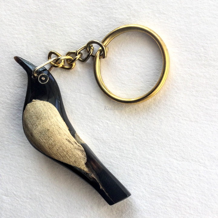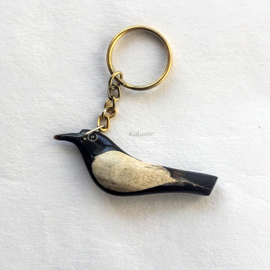 This little B&W bird keychain with a whistle is hand-carved from wood, and is then attached to a metal keychain.